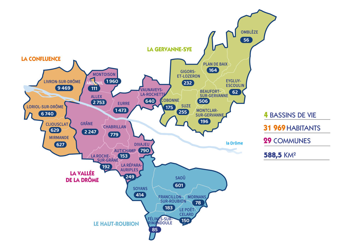 Le Val de Drôme c’est 29 communes réparties en 4 grands bassins de vie,